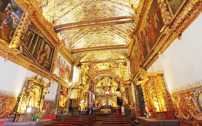 Nuestra siguiente parada será la célebre Capilla de Andahuaylillas, llamada la “Capilla Sixtina de América”. Su interior está decorado con pinturas murales, retablos dorados y una arquitectura que mezcla lo religioso y lo artístico en una obra maestra del periodo colonial.