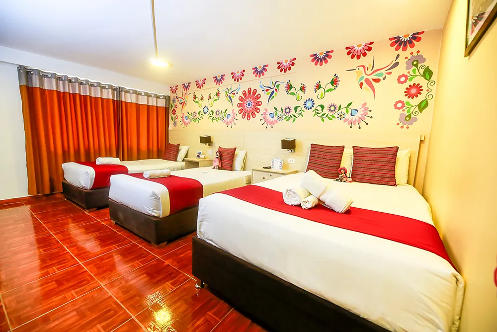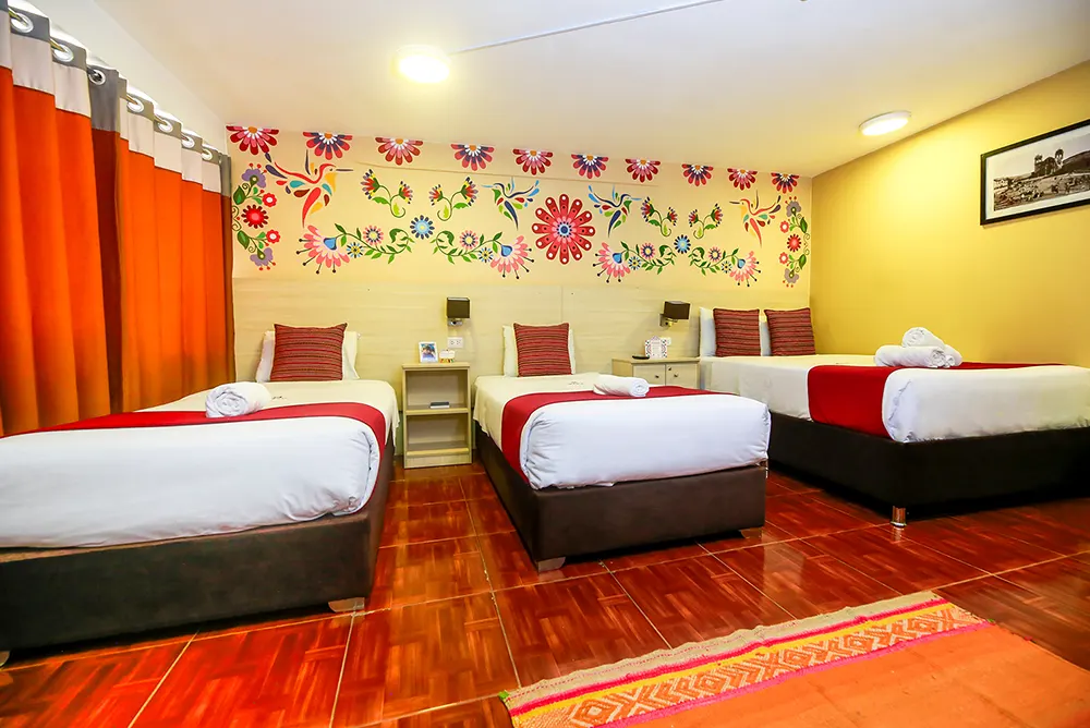 Ideal para famílias ou grupos, nosso Quarto Familiar Superior oferece o melhor conforto para sua estadia em Cusco. Com 3 camas de solteiro e meia e 1 cama de casal, este quarto oferece amplo espaço para até 5 pessoas. A decoração moderna e funcional garante conforto e descanso, tornando este quarto a opção perfeita para quem viaja em família ou com amigos e busca um lugar espaçoso e confortável.